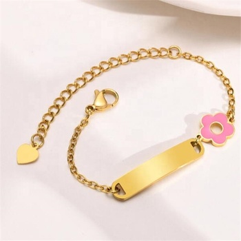 義烏AceonVelleステンレス鋼かわいい赤ちゃん子供サイズピンクエナメルフラワーブランクショートIDバーパーソナライズされた誕生日ブレスレット